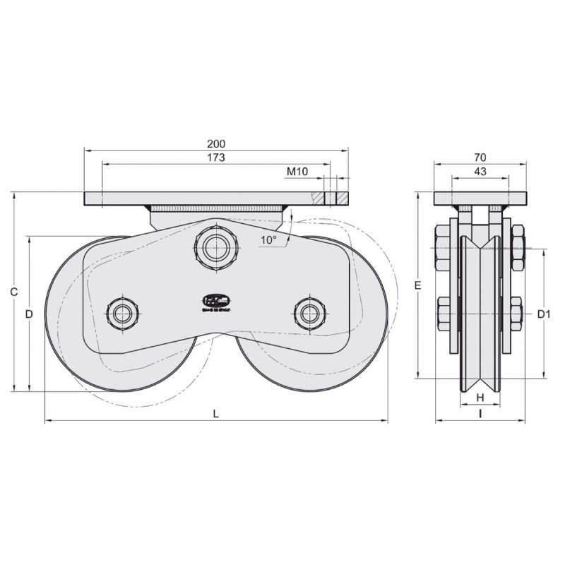 Chariot 2 roues gorge en V ø160 sur platine 200x70 ( 2)