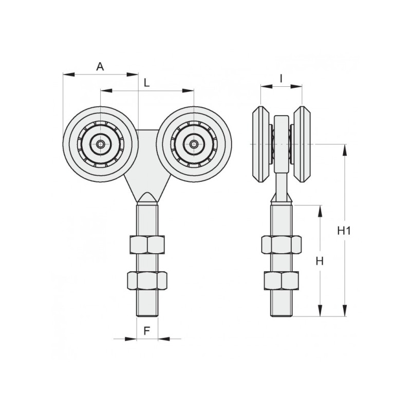 Chariot acier galvanisé à 4 roues ø45mm - axe de fixation M20 - avec roulements pour porte coulissante suspendue