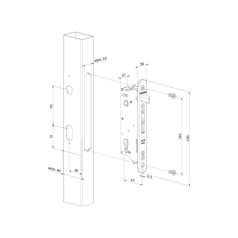 Serrure à encastrer tout inox Sixtylock Locinox - axe de 40mm - pour profils de 60mm+